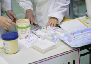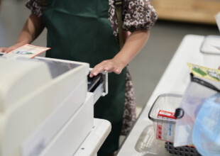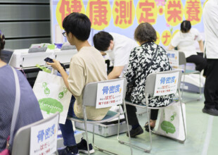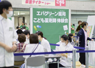 こども体験会では、薬剤師、看護師体験、レジ体験などを実施。健康測定会では、AGEs、血管年齢、骨密度、血圧、肌診断を実施。